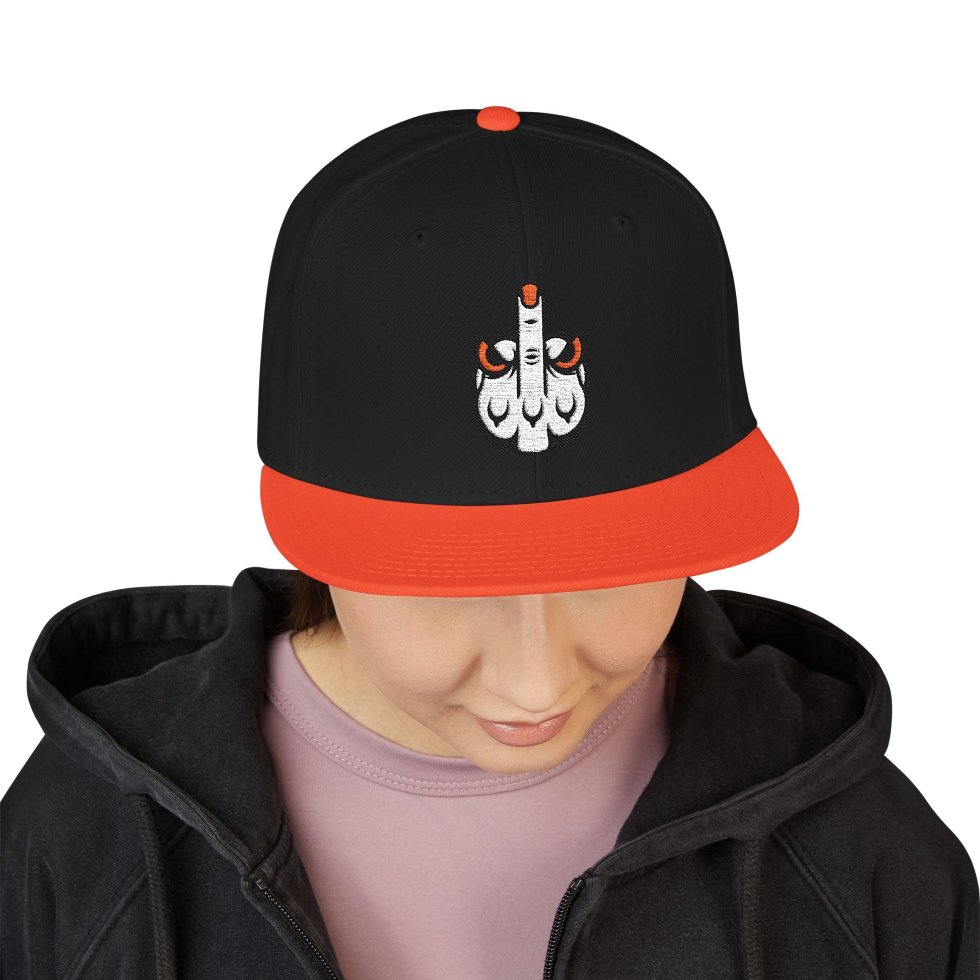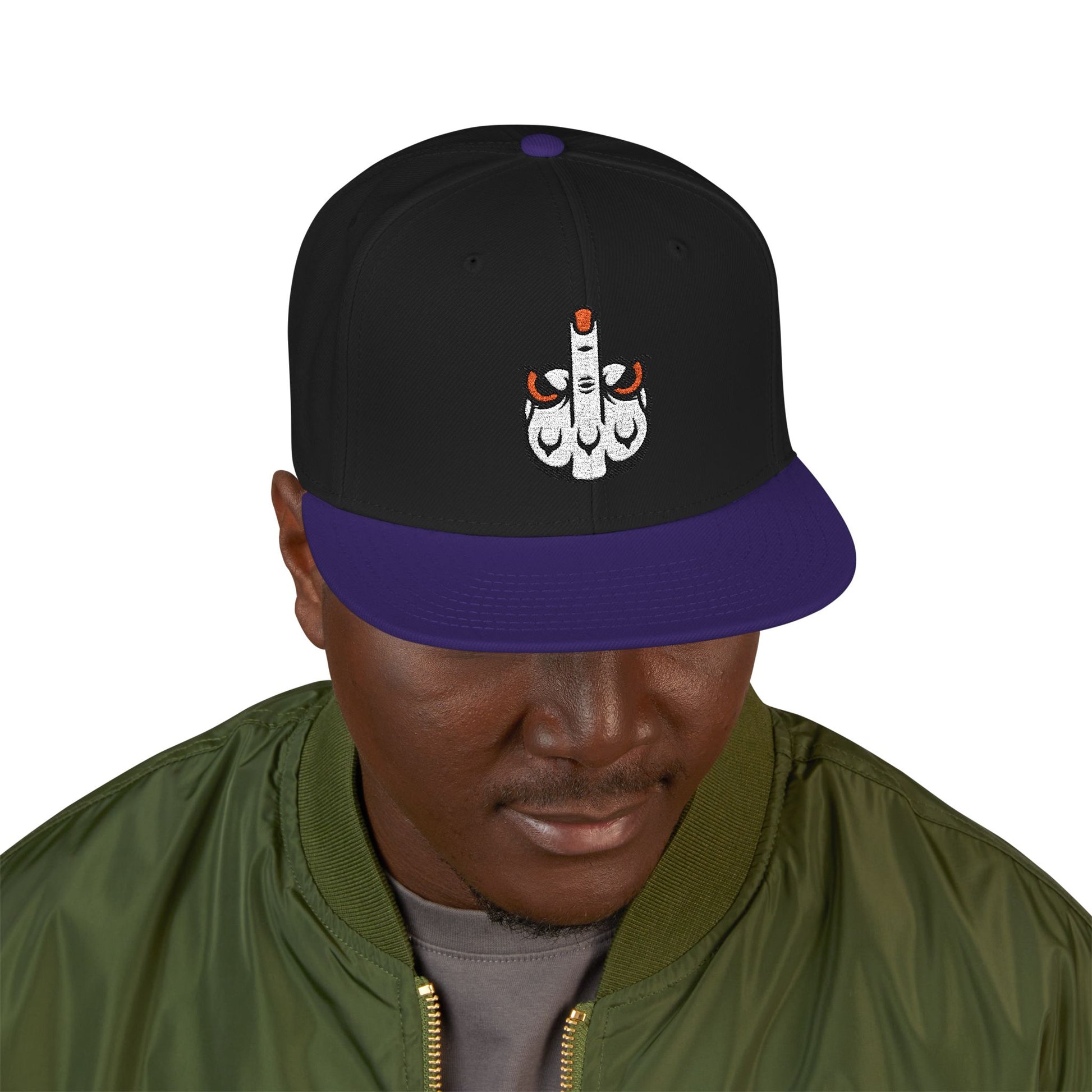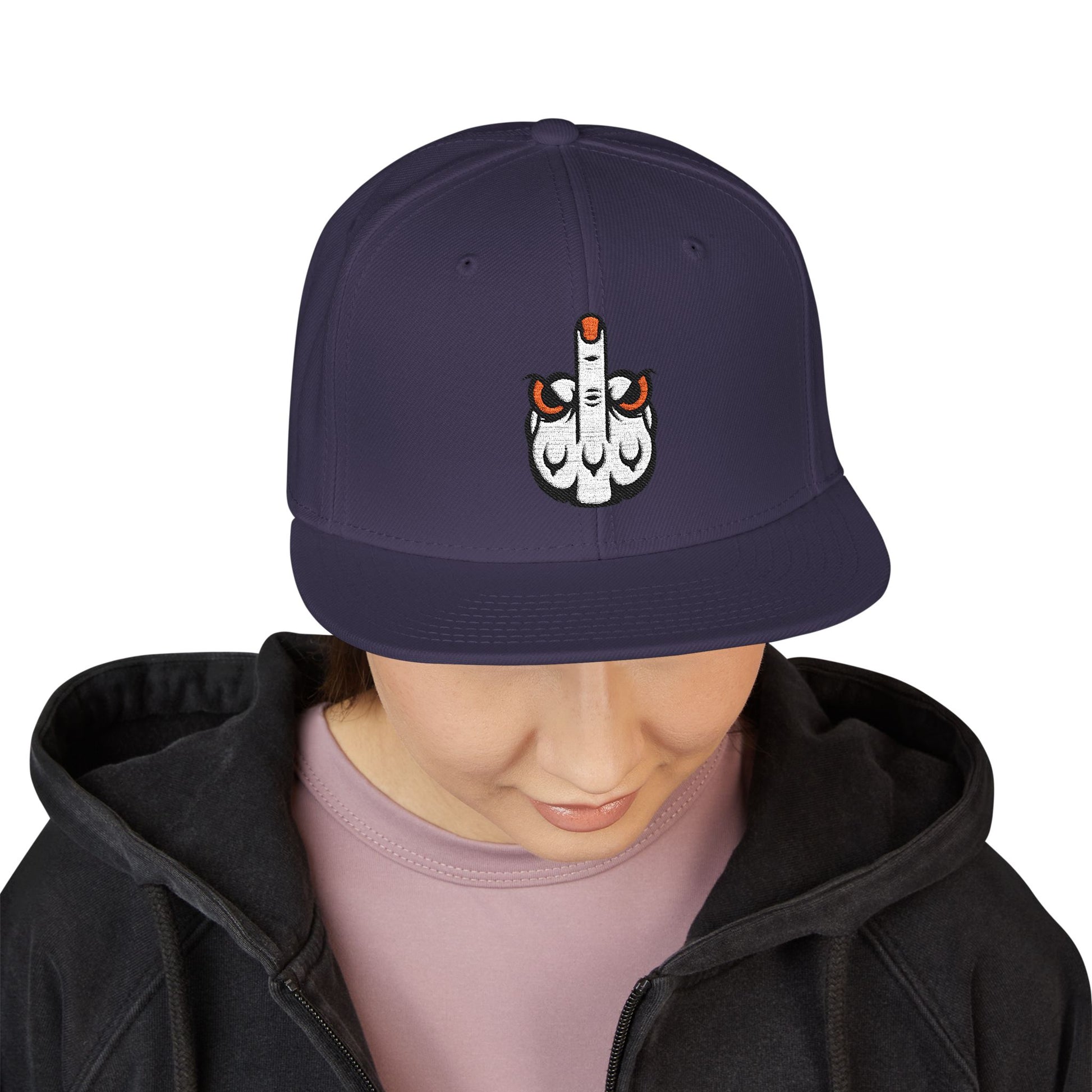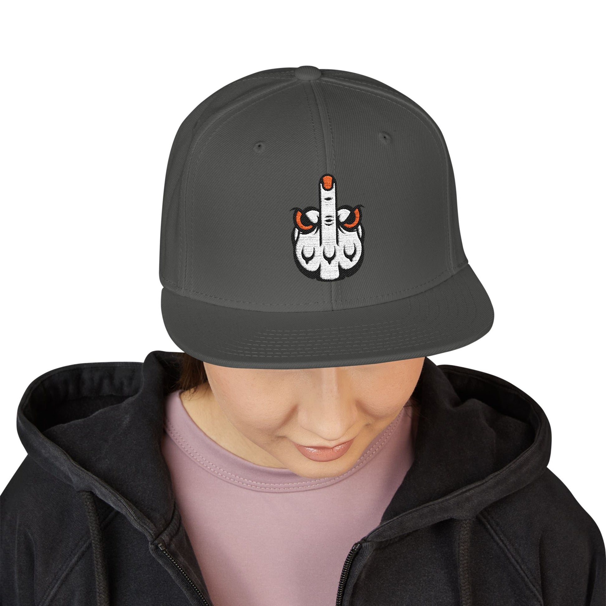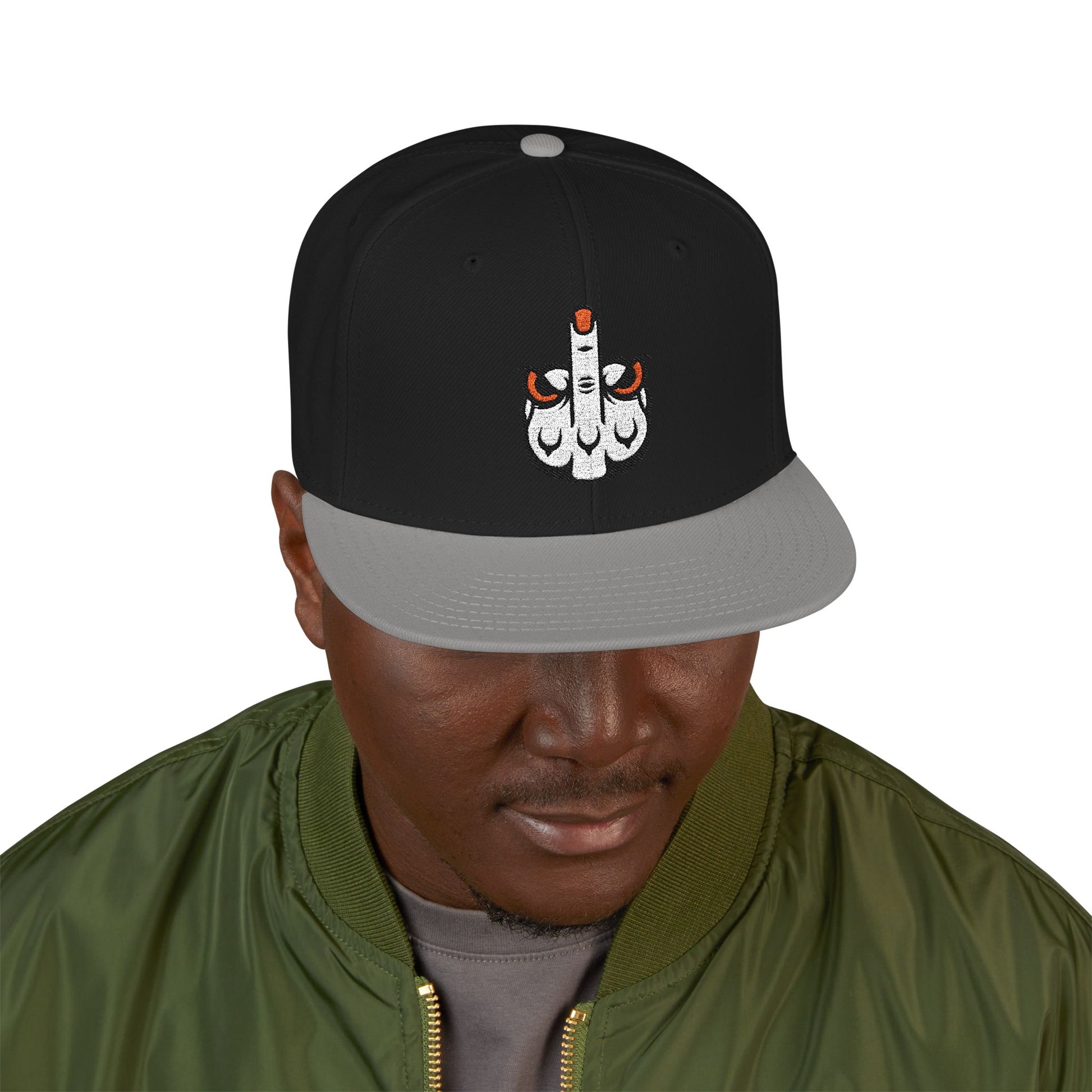A bold, structured snapback finished with crisp embroidery that reads like street art you can wear. The six-panel, high-profile crown holds its shape while the gray undervisor and contrasting black bill give it an urban, lived-in look. Small embroidered details on the side add a rebellious accent without shouting; this cap sits low or high depending on how you carry it. Built from a wool-acrylic blend and an adjustable snap closure, it feels sturdy and season-ready — a dependable topper for long days out skating, dj sets, or wandering city blocks at dusk.